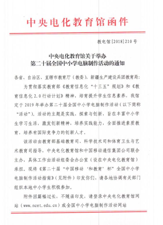近期,中央电化教育馆发布了第二十届全国中小学电脑制作活动通知,数字创作评比、创客竞赛、机器人竞赛要求不一,以附件文件为准(附件下载见文末)。