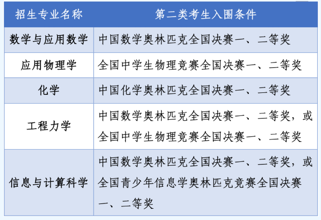 全国青少年学科奥林匹克竞赛(数学、物理、化学、信息学)全国决赛中获得一、二等奖的考生。全国青少年学科奥林匹克竞赛获奖学生以全国青少年科技竞赛获奖名单公示网站(http://gs.cyscc.org/)公示的名单为准。