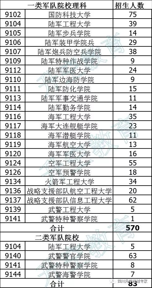 2019年,解放军院校在四川省招收普通高中毕业生680人。招收文科生院校4所,分别是国防科技大学、陆军勤务学院、战略支援部队信息工程大学、武警警官学院,共计划招收19人。