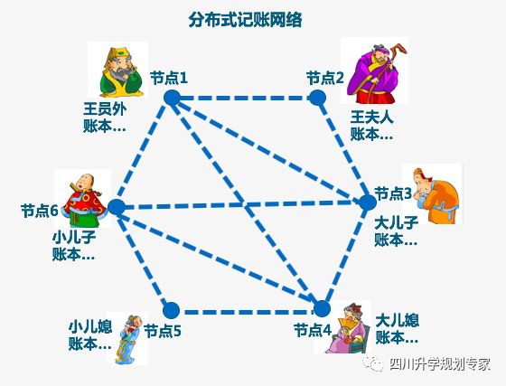 比如古时候的一个大户人家,有6个主要家庭成员:王员外、王夫人、大儿子、大儿媳、小儿子、小儿媳。本来家里一直是大儿子记账,但是小儿子有意见,怀疑老大会偷偷虚假记账藏私房钱,于是,王员外打算用区块链来解决这个问题:家里不再只由大儿子一个人记账(去中心化),而是家里的每个人在各自的账本上都记录所有收支。比如某天王员外交给大儿子100两银钱,他就向全家人通知一声(开放性),自己给了大儿子100两银钱,大家每个人都在自己的账本上记下“王员外给了大儿子100两银钱”。从此王员外家6个人每个人都成为一个“节点”,每次王员外家出现的交易都会被大家记下(匿名性)。每次记新账必须在前一天大家都公认的账本后添加新内容,所有人都会参与验证当天的交易。这样即使大儿子自己偷偷修改了账本,大家拿其他人的账本出来对比,就能马上发现问题并更正。并且,只要参与记账的人的数量足够多,就没办法随意修改数据,这使区块链本身变得相对安全,避免了主观人为的数据变更(安全性)。