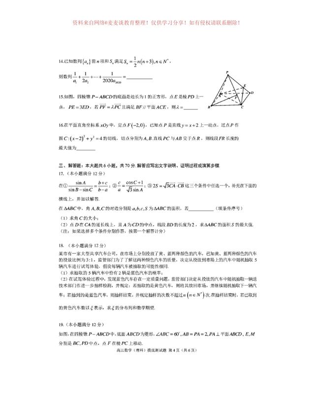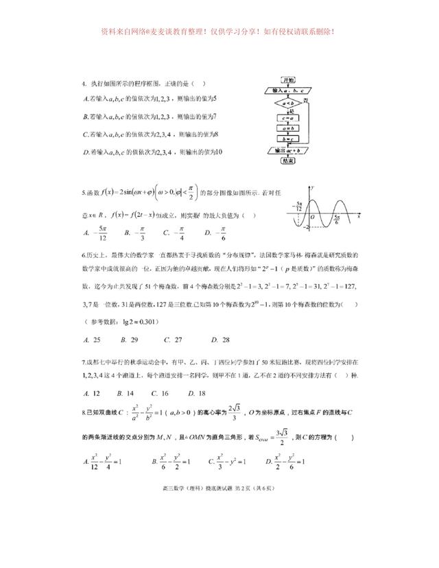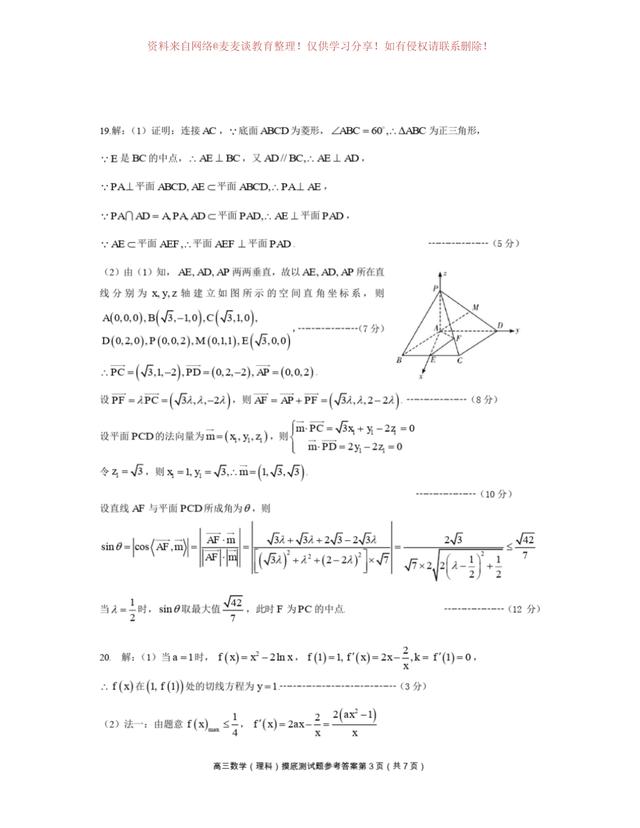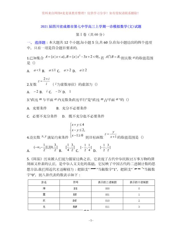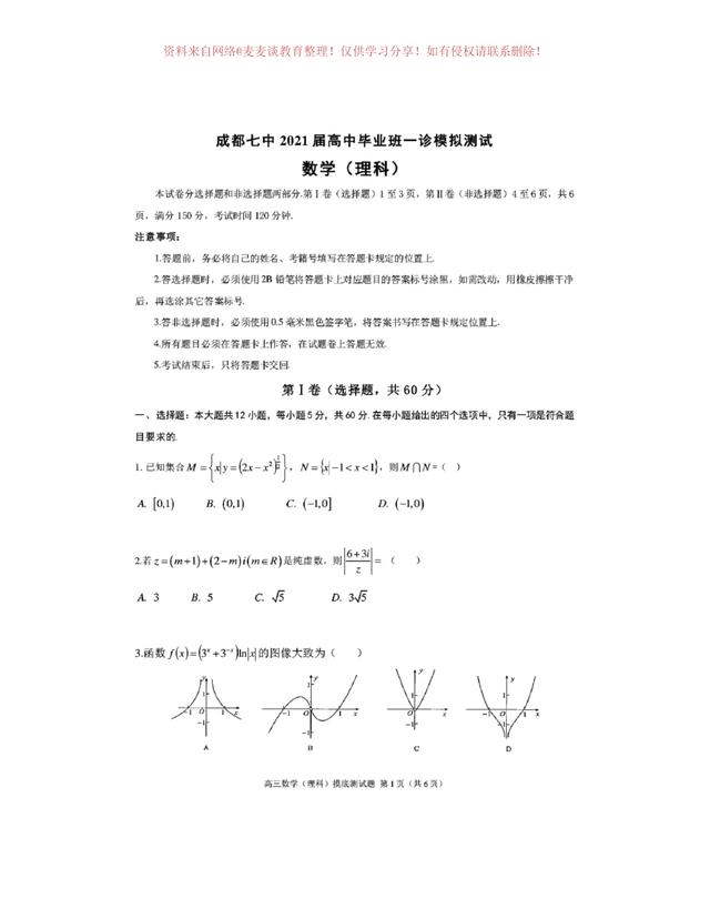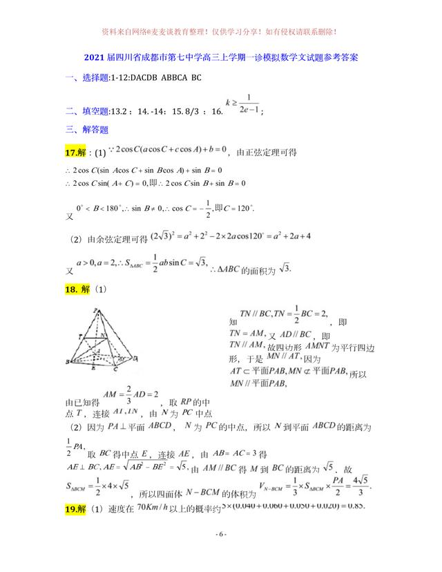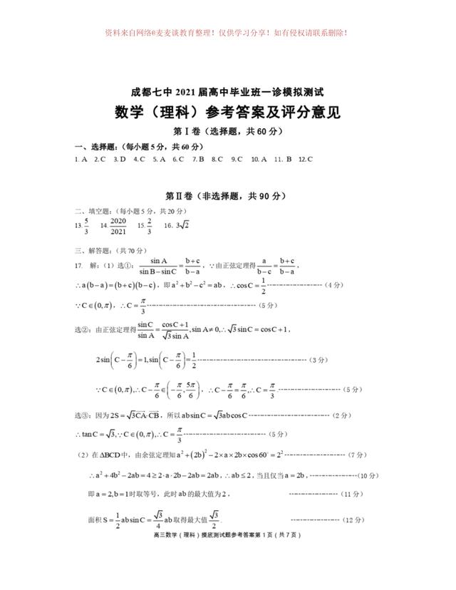 为图片格式,各位同学可以自行打印,作为模拟练习,四川省成都市第七中学2020年上学期高三年级一诊模拟测试数学试卷及答案。分为文科卷和理科卷。都含有参考答案部分。