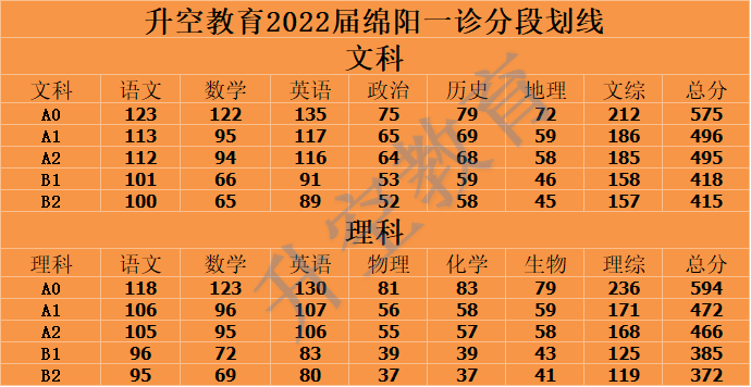 2022年11月6日下午,绵阳一诊划线公布,其中文科A0~B2分数分别为:
