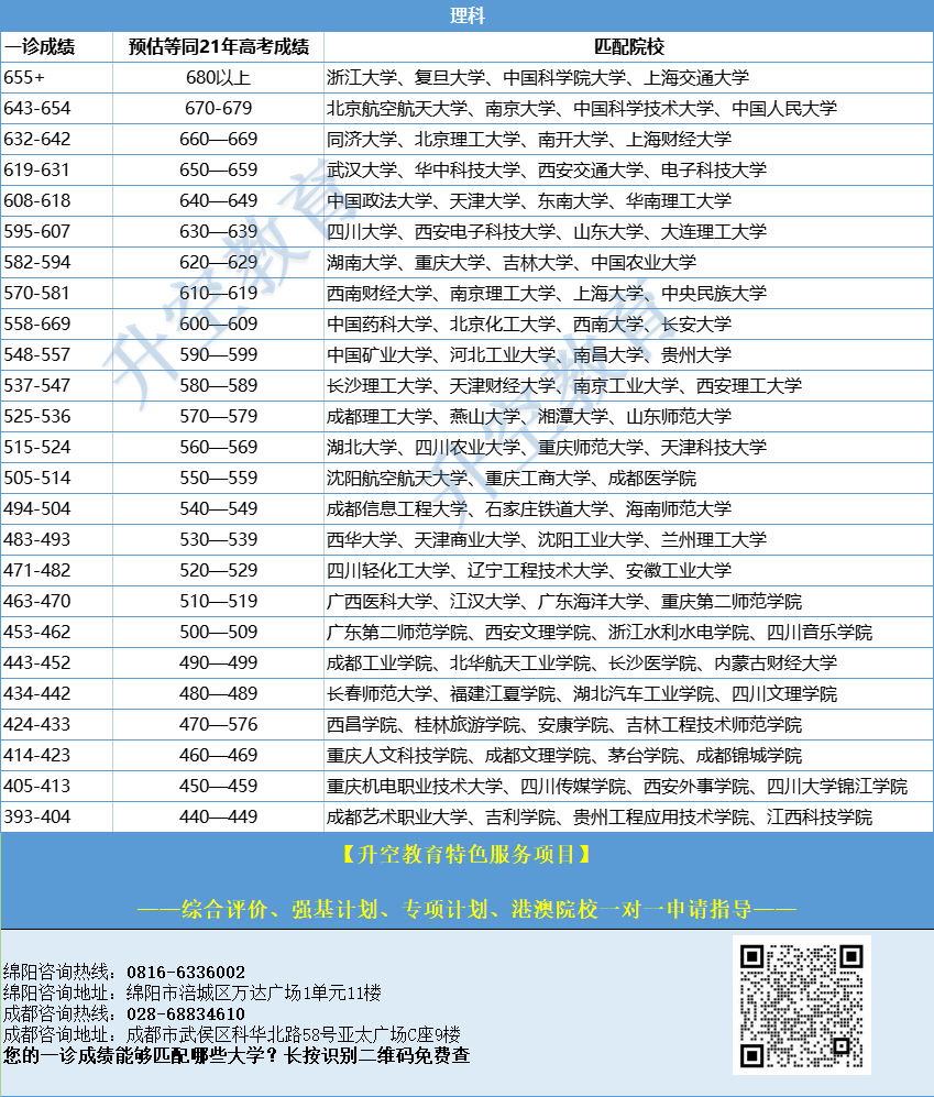 知道具体的分数后,就要开始换算将本次绵阳一诊分数换算成排名,再换成高考分数,换算后就要做模拟方案。看看自己的水平处于什么阶段,离目标院校还有多远,当然也要对应该看自己目前可以去哪些学校,记得上下浮动20、30分做模拟方案。如果不知道怎么做升学规划模拟方案可直接联系我站(四川升学规划网)线上老师详细咨询。