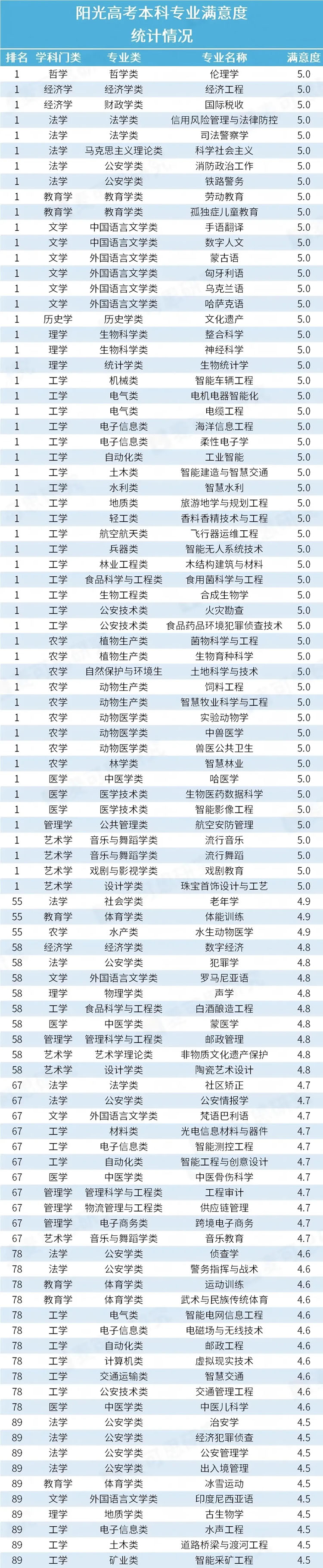 阳光高考平台公布的专业满意度得分结果均由来自全国各地的大学生实名注册后投票产生,评价范围涵盖专业的办学条件、教学质量、就业率数据与综合情况等。截至2025年6月8日,共计公布了665种本科专业的满意度得分,涵盖12个学科门类、92个专业大类。