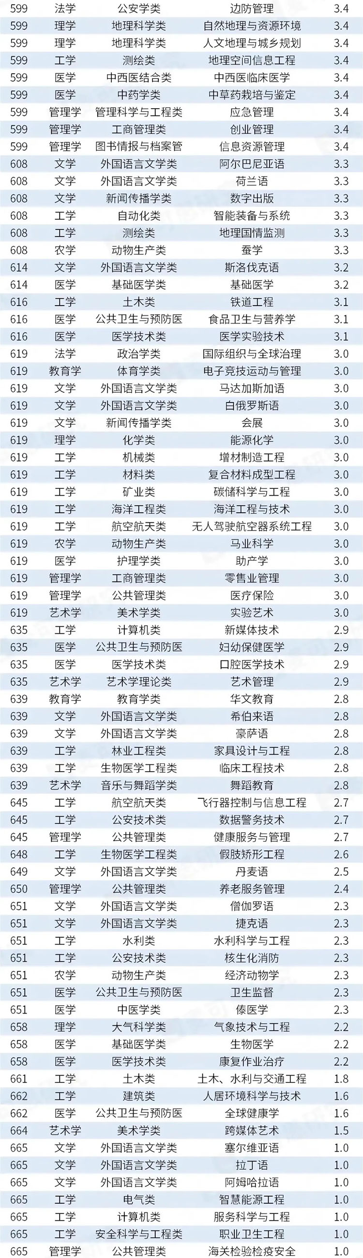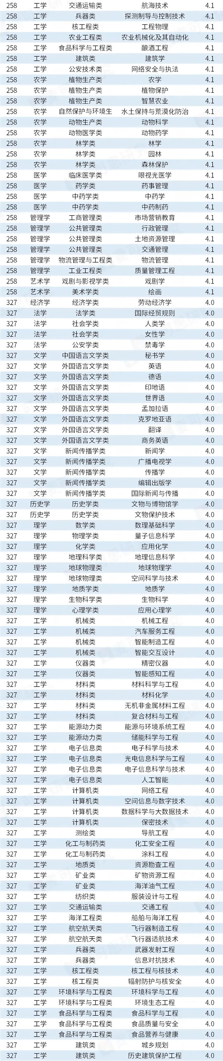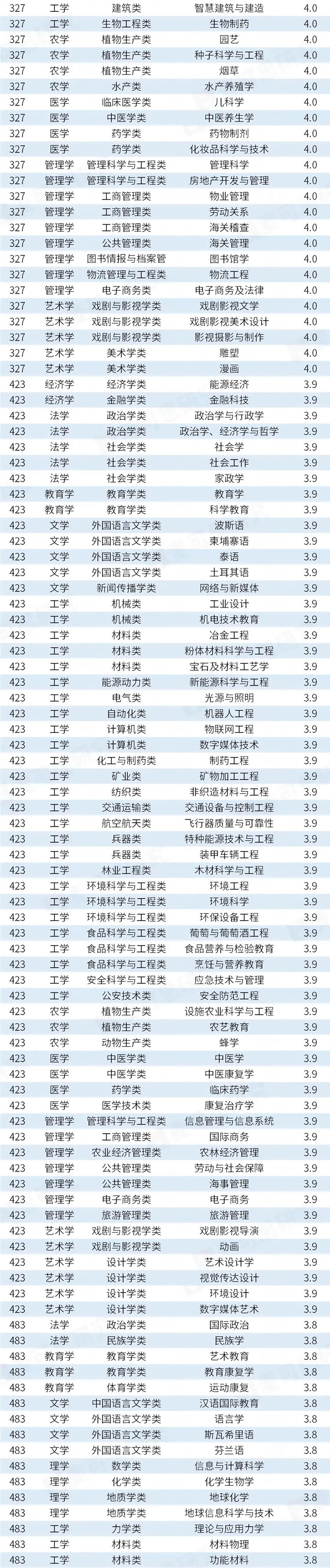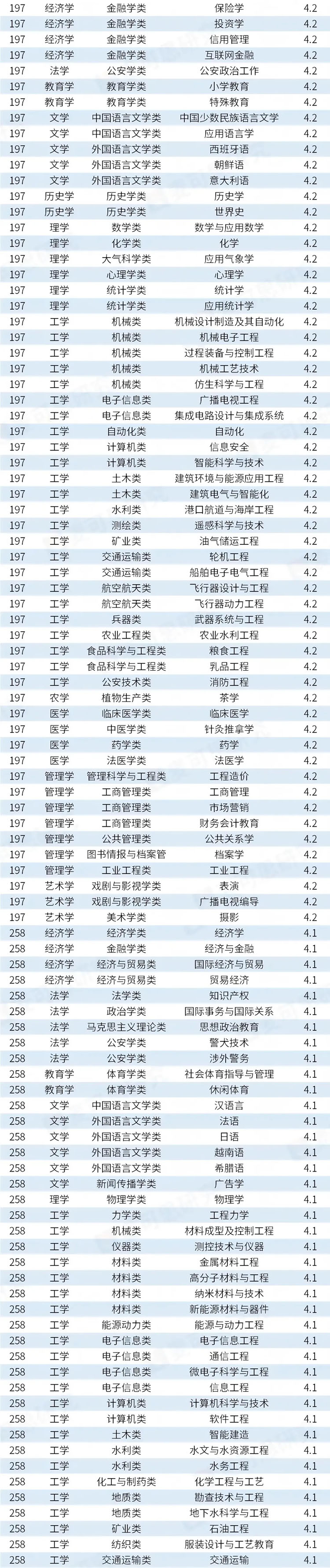 据统计,有326个专业的满意度较高,得分在4.1分及以上,占比(48.6%)接近一半。值得注意的是,得分在4.1分及以上的专业中,工学门类专业数量最多,共计114个,远超其后的文学(30个)、医学(27个)等学科领域。