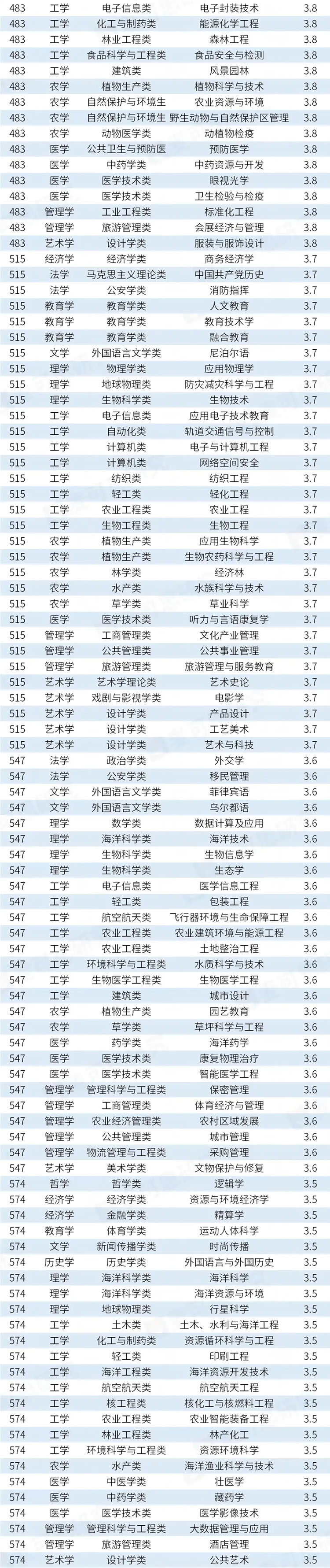 进一步分析发现,有54个专业的满意度达到了满分。其中,也是工学门类专业数量(17个)最多,之后是农学(9个)、文学(6个)。