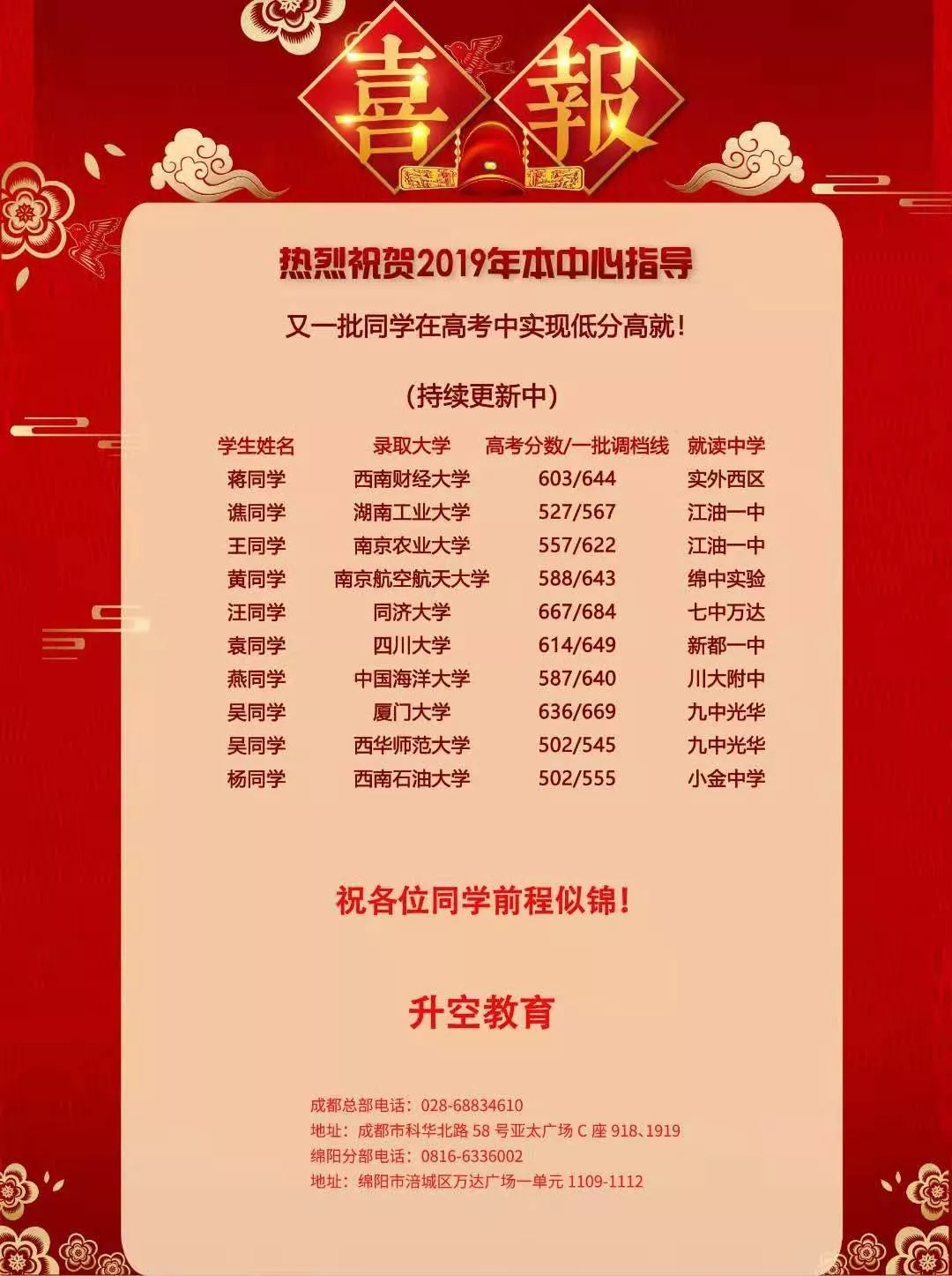 四川冠博升空教育咨询有限公司成立于2008年(以下简称升空教育),是西南片区成立最早的升学规划指导机构之一,也是率先引进ISO9001“高中生升学咨询服务”国际质量认证体系的机构。我们服务的主要内容有:高考志愿填报、强基计划、综合评价、少数民族预科、国家专项、高校专项、地方专项、高水平艺术团、高水平运动队、高中生学情管理、大学生学业与职业规划等项目,全方位多渠道为高中学子量身定制升学规划。公司以“诚信负责、质量为本、勤学精进、开拓创新”的服务理念,多年来帮助万余名学子实现学业梦想。