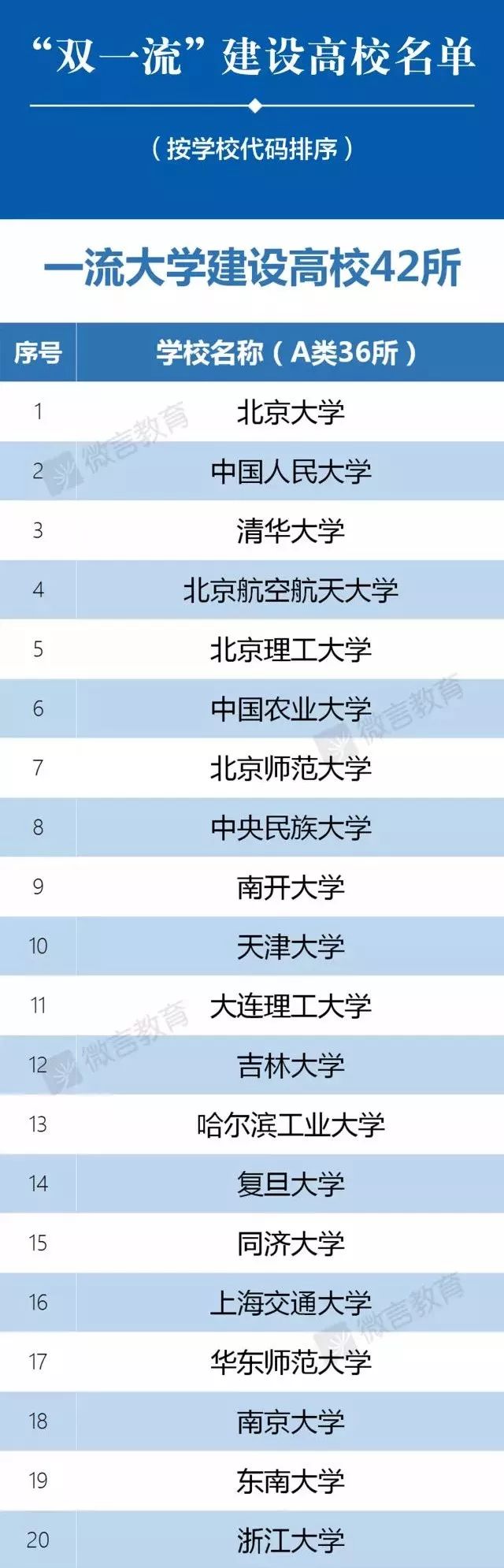 2017年9月21日,教育部、财政部、国家发展改革委联合发布《关于公布世界一流大学和一流学科建设高校及建设学科名单的通知》,世界一流大学和一流学科建设高校及建设学科名单正式确认公布,首批双一流大学建设高校共计137所,其中世界一流大学建设高校42所(A类36所,B类6所),世界一流学科建设高校95所。