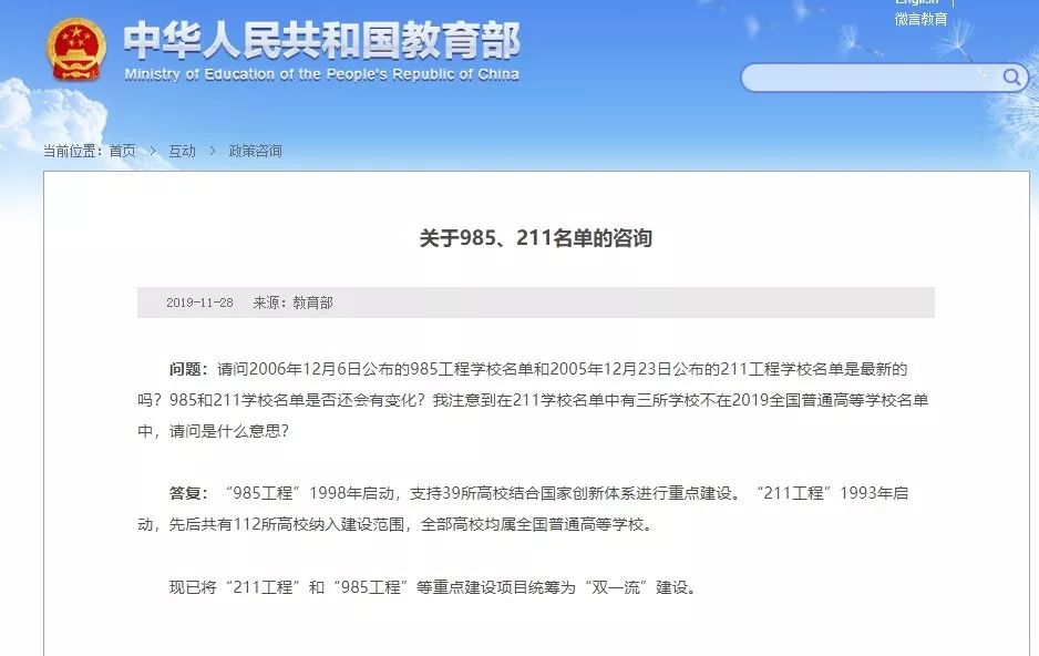 问题:请问2006年12月6日公布的985工程学校名单和2005年12月23日公布的211工程学校名单是最新的吗?985和211学校名单是否还会有变化?我注意到在211学校名单中有三所学校不在2019全国普通高等学校名单中,请问是什么意思?