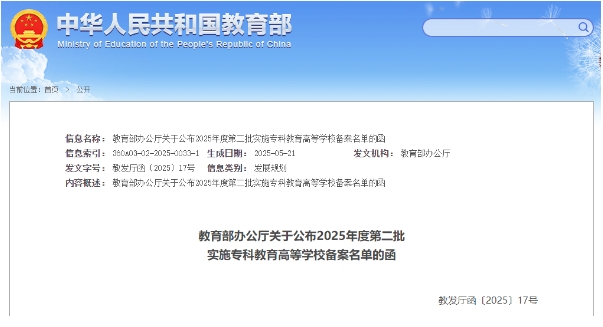 5月28日,教育部发布《关于公布2025年度第二批实施专科教育高等学校备案名单的函》,根据《中华人民共和国高等教育法》《普通高等学校设置暂行条例》等有关法律法规和政策文件的规定,现将省级人民政府审批设置的专科层次高等学校备案名单予以公布。