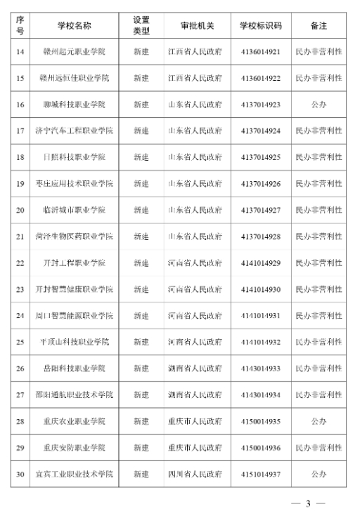 据统计,名单公布了34所新设专科院校,其中32所院校为新建。分办学性质来看,14所公办院校,20所民办院校。具体名单如下: