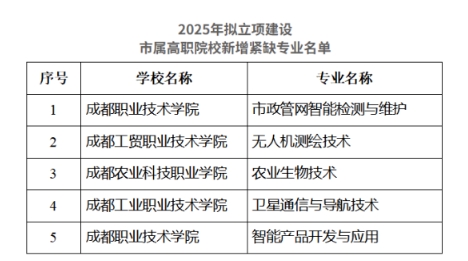 日前,成都市教育局发布《2025年市属高职院校新增紧缺专业建设项目名单公示》,拟遴选建设5个市属高职院校新增紧缺专业,包括:市政管网智能检测与维护、无人机测绘技术、农业生物技术、卫星通信与导航技术、智能产品开发与应用。
