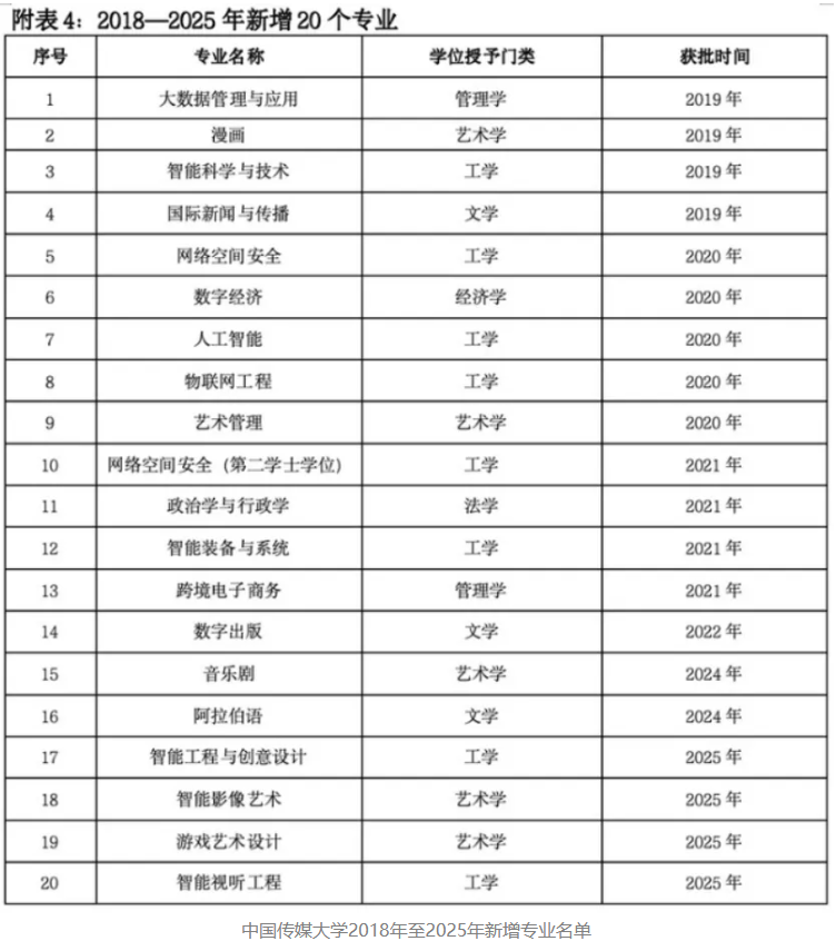 在这一背景下,中国传媒大学的专业调整,只是本轮高等教育结构优化中的一个缩影。在减少传统专业的同时,中传也在不断增加新的专业方向。自2018年以来,中传新增了智能科学与技术、国际新闻传播、智能影像技术等20个专业,多与数字技术、人工智能以及媒体融合的发展方向相关。