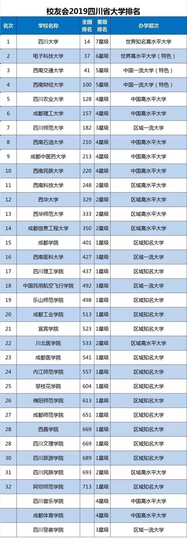 报告显示,在最新校友会2019中国大学排名中,四川大学、电子科技大学、西南交通大学、西南财经大学、四川农业大学、成都理工大学、四川师范大学、西南石油大学、成都中医药大学、西南民族大学雄居校友会2019四川省大学排名前10强,四川省共有4所高校跻身全国百强行列。