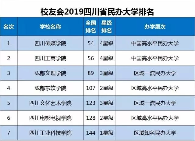 在校友会2019中国民办大学排名中,四川传媒学院、四川工商学院、成都文理学院、成都东软学院、四川文化艺术学院名列校友会2019四川省民办大学排名前5强。