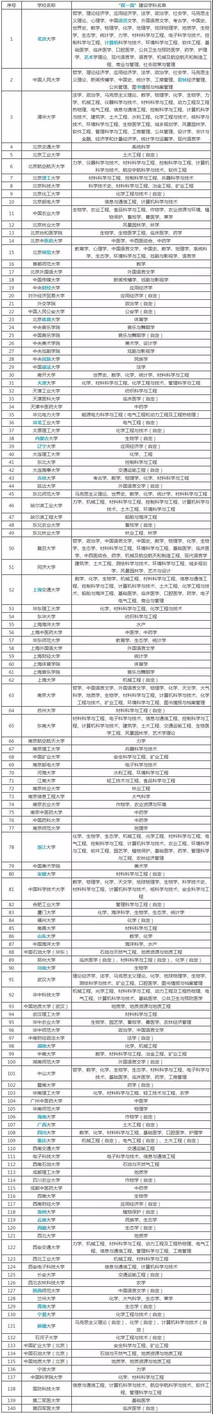 当然,42所世界一流大学都是世界一流学科建设高校,所以严格上说世界一流学科建设高校名单有140所,以下是具体名单和建设学科。