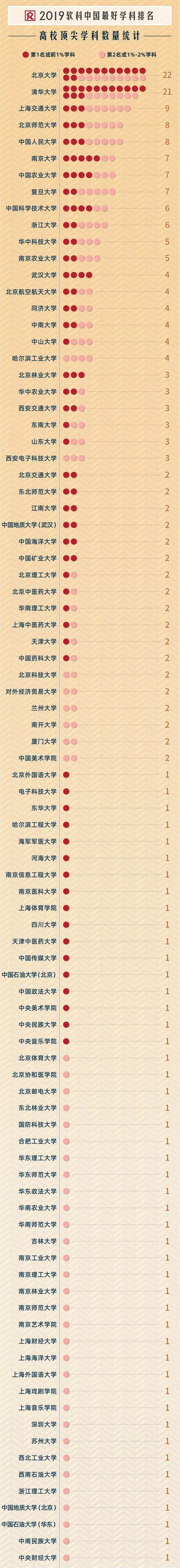 从全国第一名或者前1%学科数量来看,清华大学有14个,北京大学有13个。南京大学有5个,中国农业大学、中国科学技术大学和武汉大学各有4个。