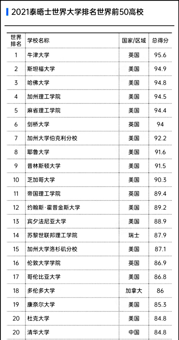2021年泰晤士世界大学排名