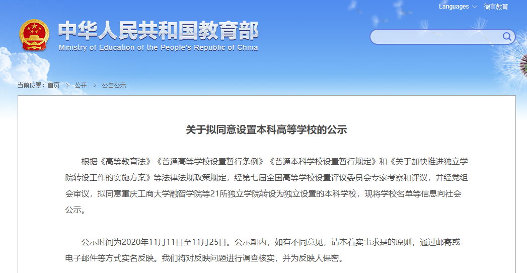 11月11日,教育部发布《关于拟同意设置本科高等学校的公示》,拟同意重庆工商大学融智学院等21所独立学院转设为独立设置的本科学校,公示时间为2020年11月11日至11月25日。