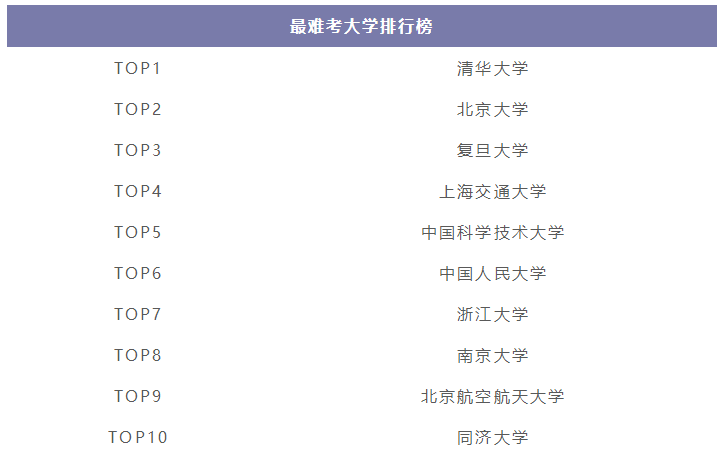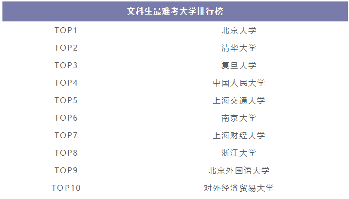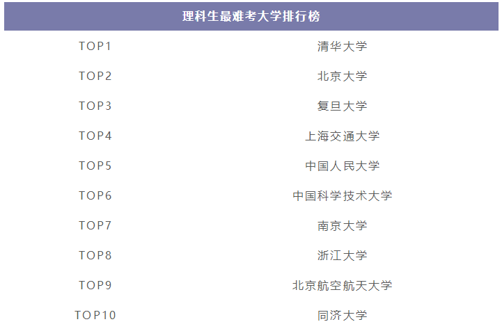 果然,无论对于文科生还是理科生来说,清华大学、北京大学和复旦大学当之无愧为最难考的前三名。