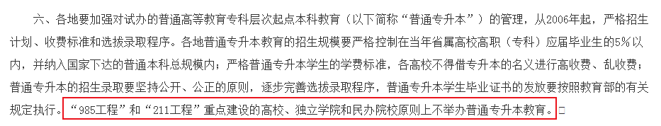 早在2006年,教育部发布的一则“普通高等教育分学校分专业招生计划的通知”中,已有“985工程”和“211工程”重点建设的高校等原则上不举办普通专升本教育的内容。