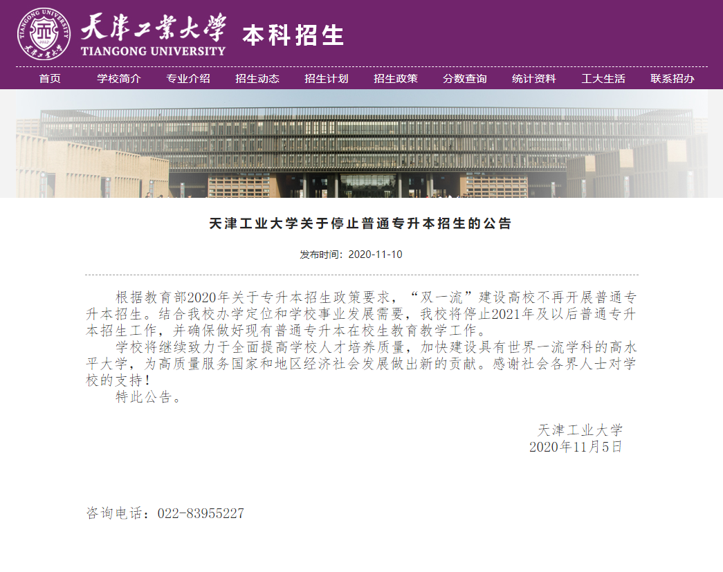 前段时间,天津工业大学发布了一则公告,表示将“停止普通专升本招生”。