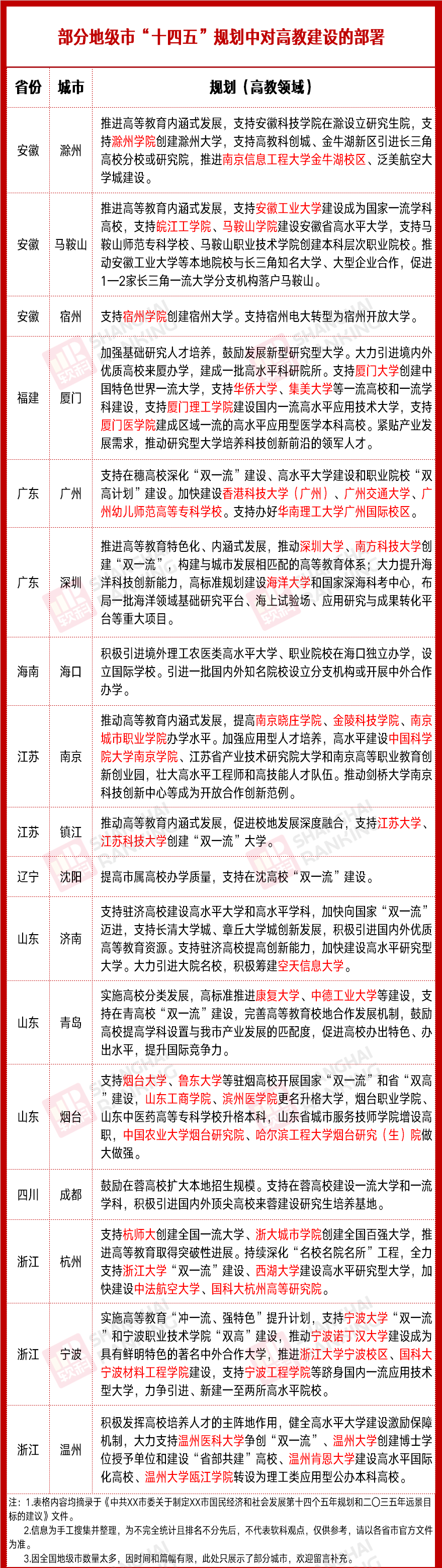 四川省、江西省、天津市等提出加快高等学校“双一流”建设;安徽省、烟台市、温州市等点名支持地方高校争创“双一流”;广东省、山东省、重庆市等提出“十四五”期间要加快建设新大学;还有的省市提出在建设本土高校的基础上,积极引进更多国际国内知名院校落户。