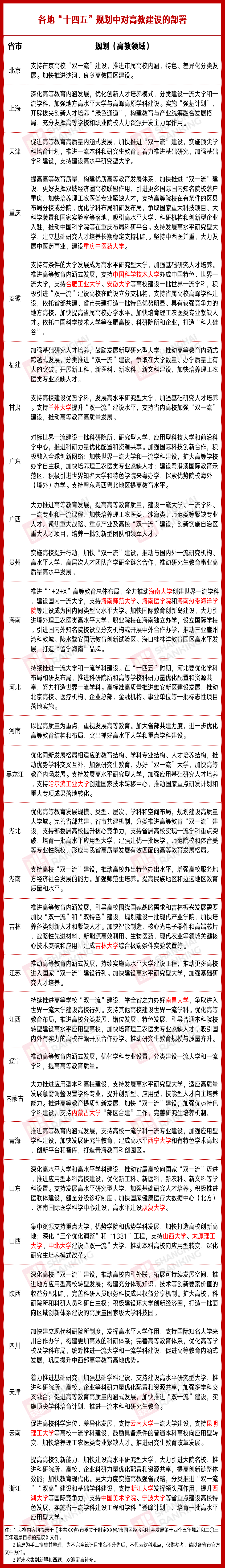 进入2020年12月份后,内地多个省市先后发布了“十四五”规划建议,各地区对未来高教领域建设的部署也随之出炉。