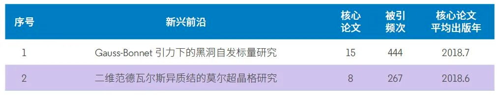 该领域中,共有2个新兴前沿,一项聚焦理论物理研究,即“Gauss-Bonnet引力下的黑洞自发标量研究”,一项聚焦凝聚态物理研究,即“二维范德瓦尔斯异质结的莫尔超晶格研究”。