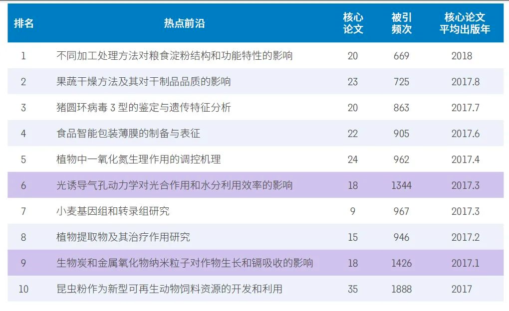 Top10热点前沿主要分布在食品科学与工程、动物传染病、植物生理、作物科学、药用植物、动物营养六个子领域。其中,食品科学与工程热点前沿数量最多,有3个,分别是粮食加工方法、果蔬干燥加工和食品智能包装研究。