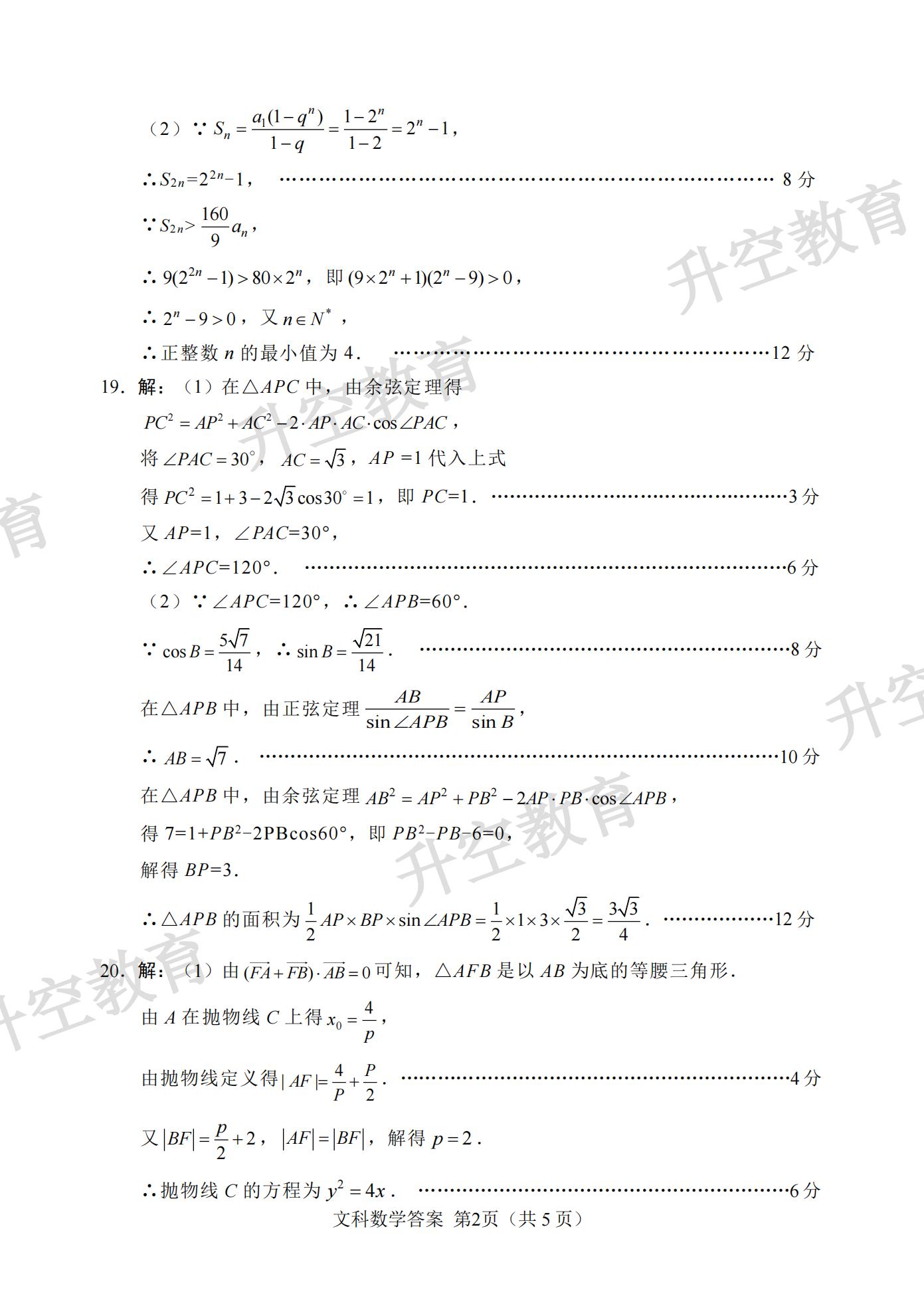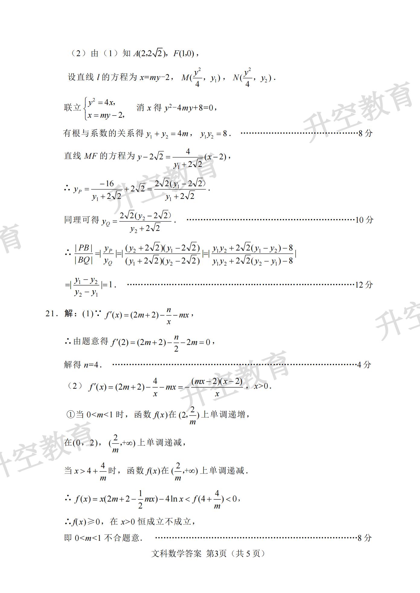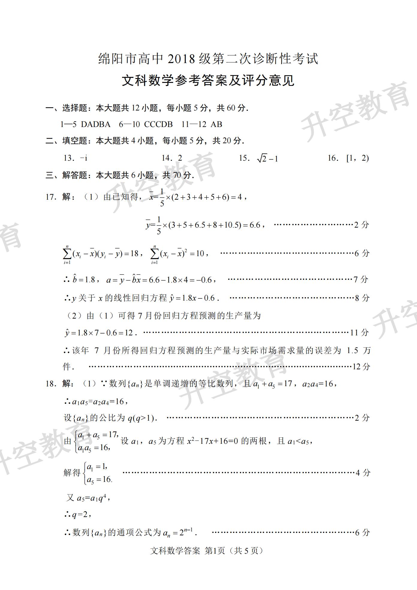 2021绵阳二诊文科数学答案: