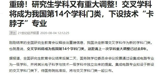 2020年7月,全国研究生教育会议释放出重磅信息,我国决定新增交叉学科作为新的学科门类,集成电路将成为一级学科↓↓↓