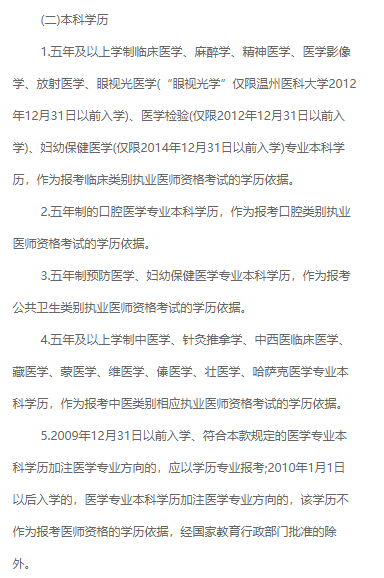 此处大家也可看一看《医师资格考试报名资格规定》关于本科学历的相关规定。从下图中我们也可以看到,对眼视光学、医学检验、妇幼保健医学作了时间限定 ,也就是说在此时间范围外,得按新规定执行。可别看错了。