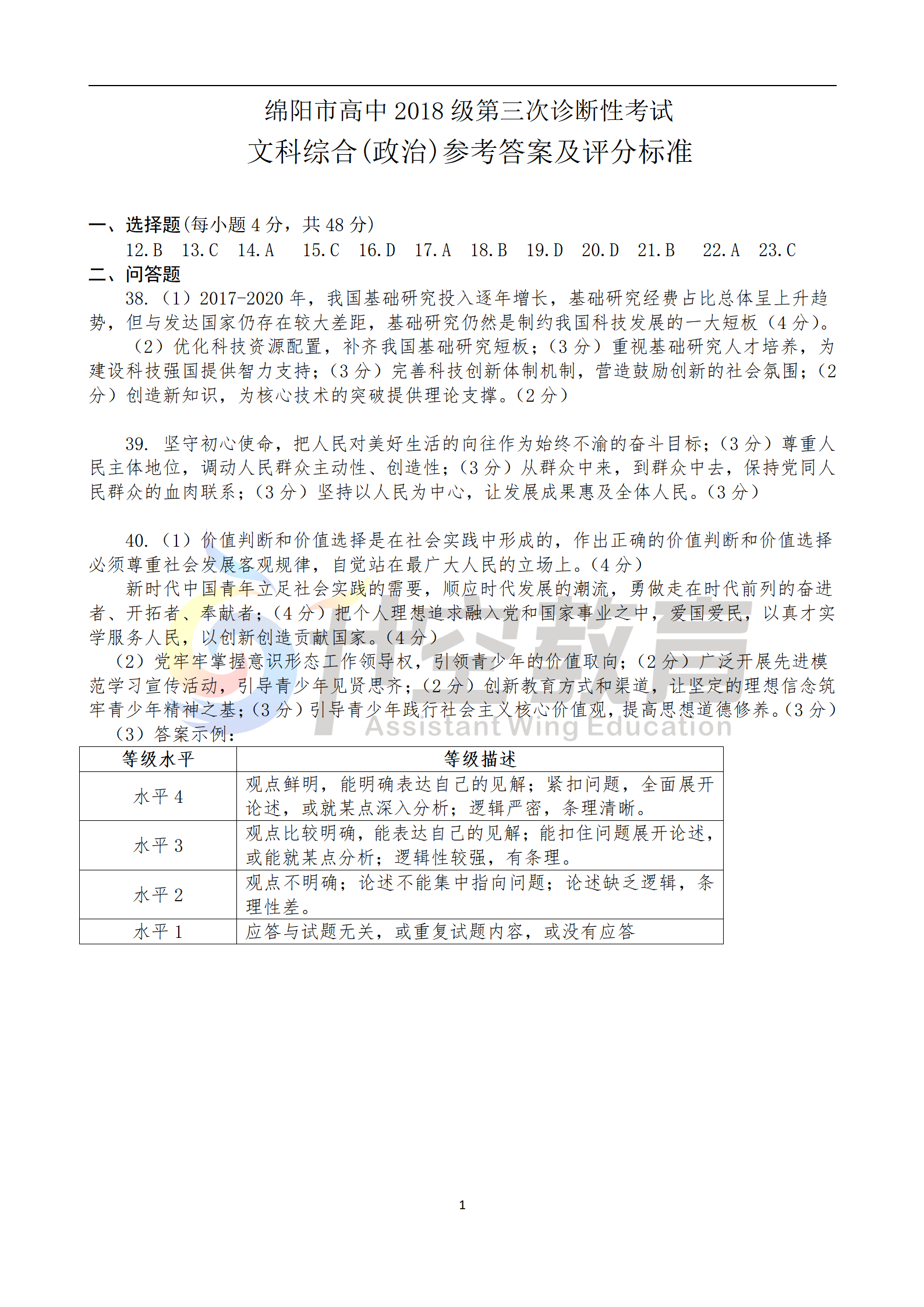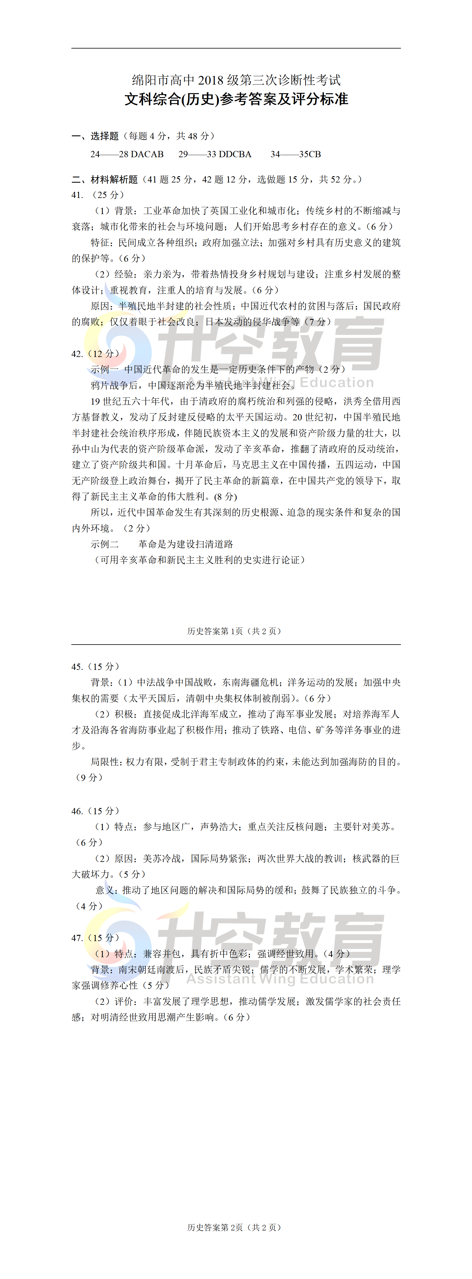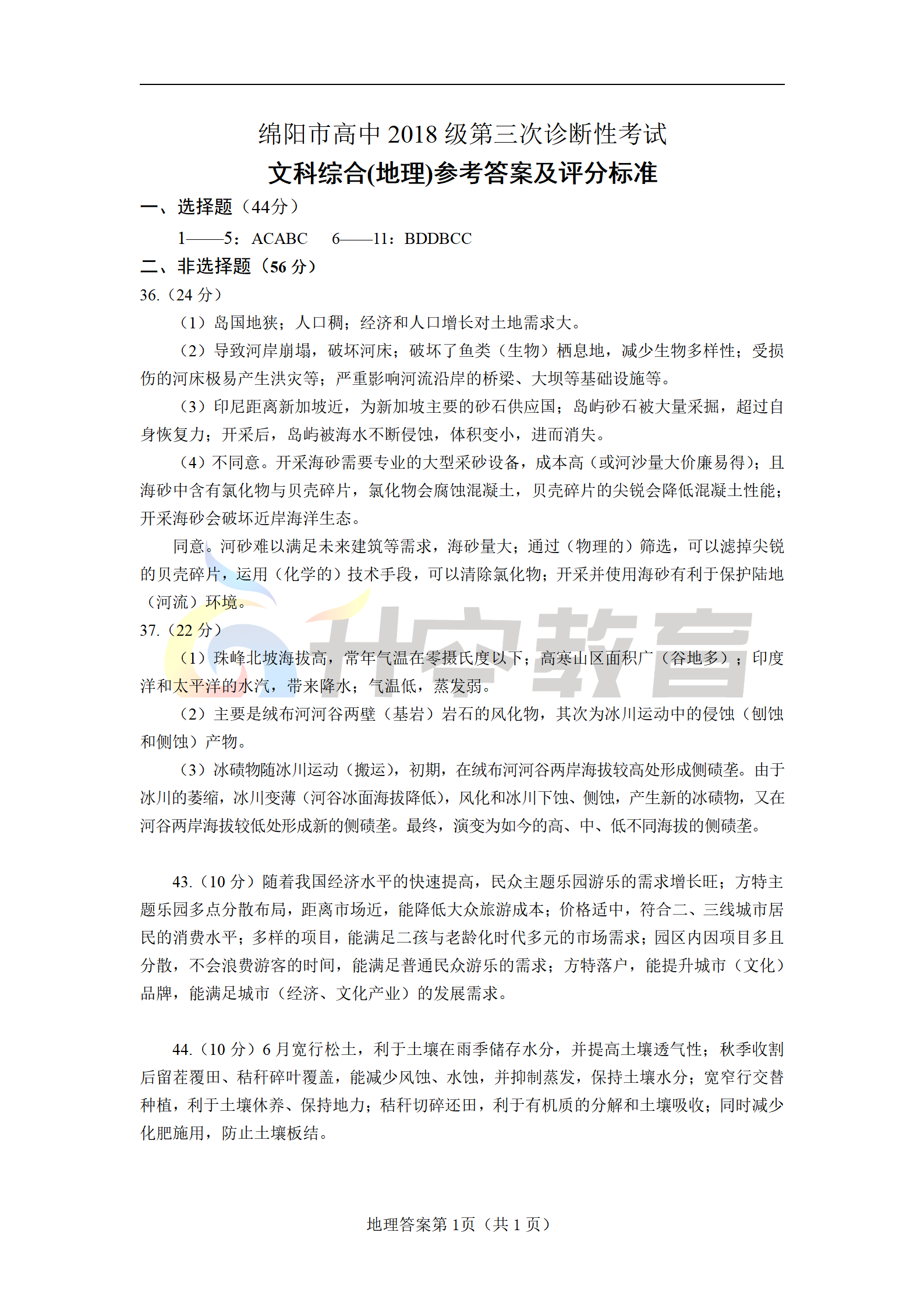 2021绵阳三诊文综答案(图片可直接保存):