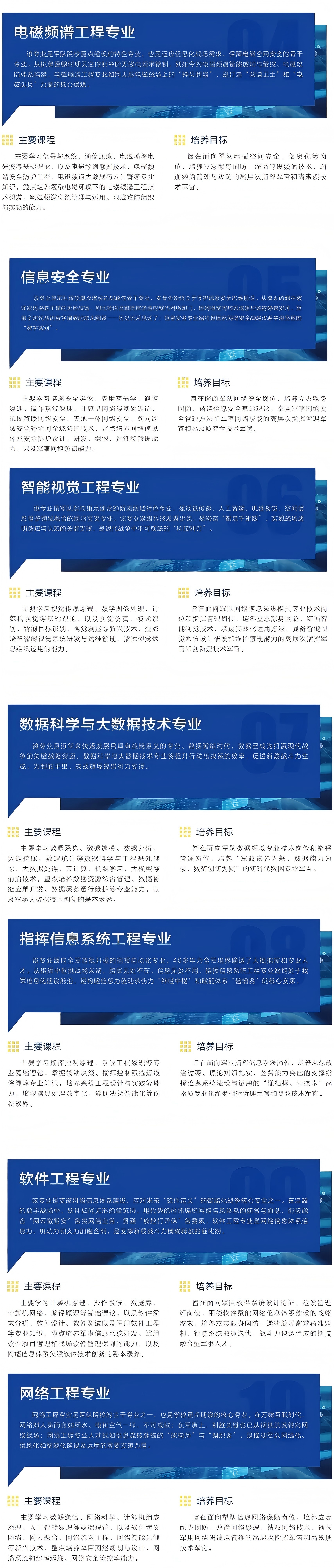 信息支援部队工程大学以国防科技大学信息通信学院、陆军工程大学通信士官学校为基础组建,校本部位于湖北武汉,首次面向社会招生,10个本科专业,100%信息化智能化。