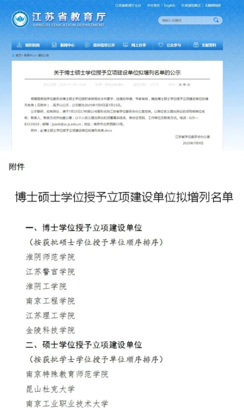 7月9日,江苏省教育厅发布《关于博士硕士学位授予立项建设单位拟增列名单的公示》。名单显示,淮阴师范学院、江苏警官学院、淮阴工学院、南京工程学院、江苏理工学院、金陵科技学院等6所高校拟获批博士学位授予立项建设单位;南京特殊教育师范学院、昆山杜克大学、南京工业职业技术大学等3所学校拟获批硕士学位授予立项建设单位。