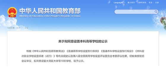 6月11日,教育部发布《关于拟同意设置本科高等学校的公示》,拟同意设置大湾区大学、宁波东方理工大学等10所学校