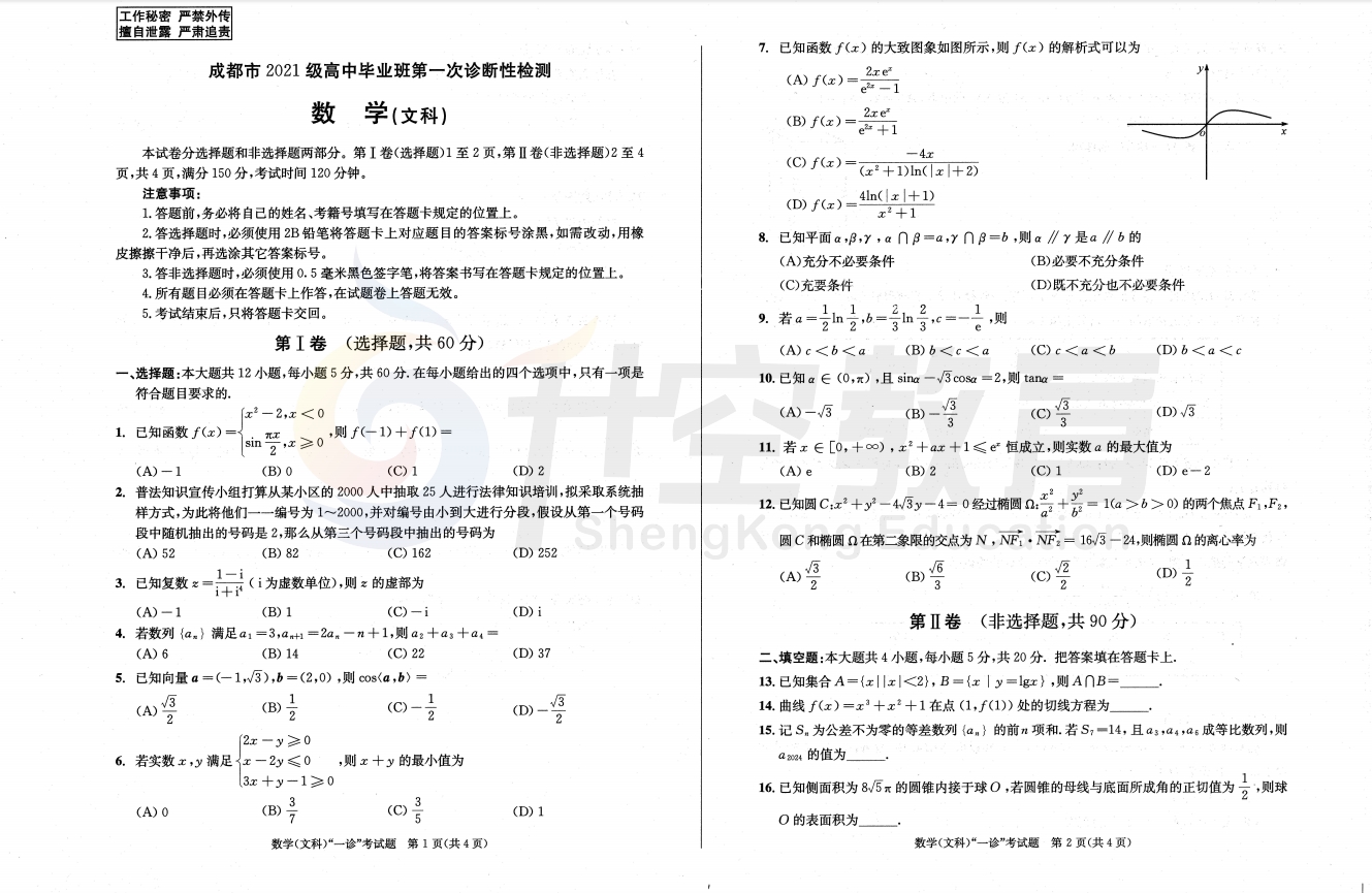 2024届成都一诊文科数学试题: