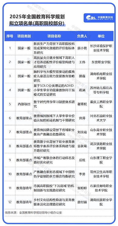 8月5日,全国教育科学规划领导小组办公室发布《2025年度全国教育科学规划拟立项名单公示》。共540项个项目拟获立项资助,其中包括12所高职院校申报的12个项目。