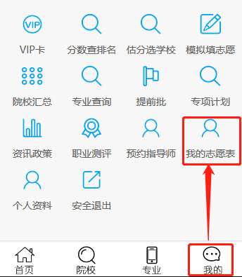 5.我们将保存您的每一次模拟填报结果,您可以点击底部菜单:我的---我的志愿表,查看您的每一次模拟填报结果