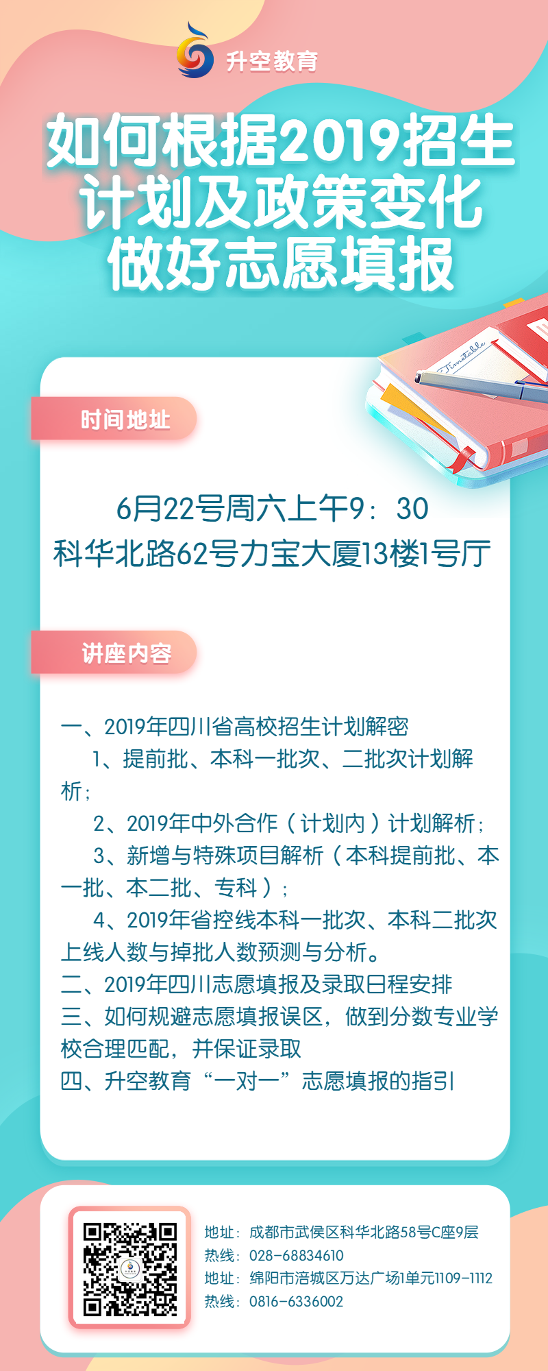 2019年招生计划已出,高考报名人数激增,招生计划却在减少,招生类型也发生了比较大变化,到底如何才能帮助学生选好专业院校,保证既不浪费分,又能选择适合的专业院校呢?升空教育为你答疑解惑,记得提前安排好时间,准时参加!