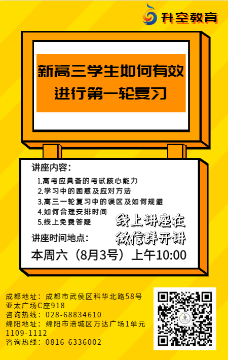 升空教育专家周六上午10点将在微信群里为大家带来《新高三学生如何有效进行第一轮复习》线上公益讲座: