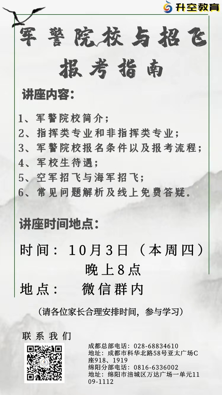 国庆佳节,举国同庆,升空教育祝祖国母亲70华诞,生日快乐!升空教育本周线上公益讲座将为各位家长分享并解析《军警院校及招飞报考指南》,从多个方面帮助家长了解学习军警院校及招飞,包括:军警院校简介、指挥类和非指挥类专业解析、军警院校报名条件及流程、军校生的待遇以及空军海军招飞政策详解等,同时也会为各位有疑难困惑的家长做在线免费答疑,欢迎各位家长前来聆听学习。