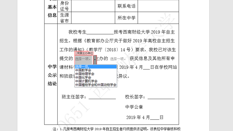 11.《西南财经大学2019年自主招生公示无异议证明》怎么填?