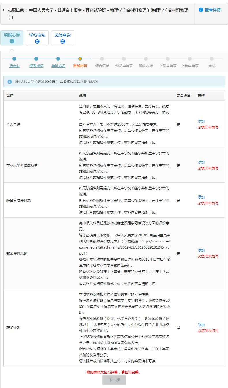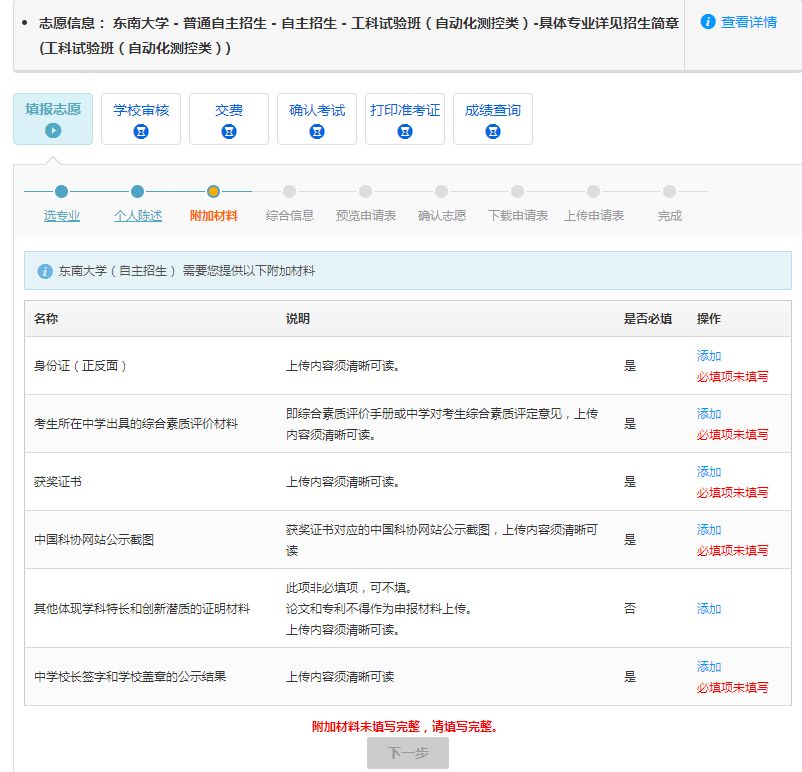 确认志愿前,上传材料一般在附加材料和综合信息栏目中上传。一般需要上传的材料有:奖项证书、身份证、综合素质评价表、中学公示的结果等等。
