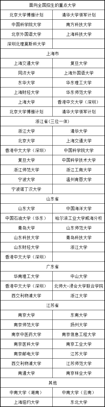 说明:上表中面向全国招生的部分高校实际只面向部分省市招生,具体以各校当年招生简章为准。