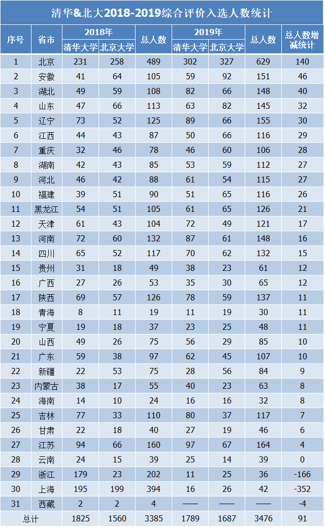2019年自主选拔政策趋严,综合评价招生成了很多考生进名校的路径之一。清华大学、北京大学2019年综合评价录取已经完成,那么,今年清华北大综合评价入选数据如何?与去年对比又有哪些变化?20届考生备考应该如何从中汲取经验?