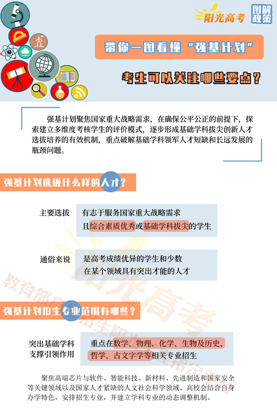 强基计划聚焦国家重大战略需求,在确保公平公正的前提下,探索建立多维度考核学生的评价模式,逐步形成基础学科拔尖创新人才选拔培养的有效机制。重点破解基础学科领军人才短缺和长远发展的瓶颈问题。