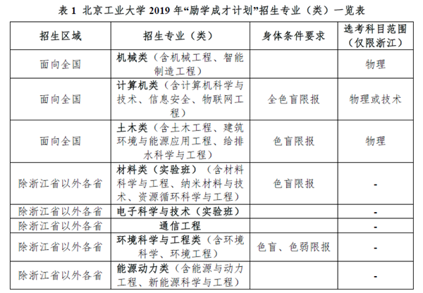 为深入贯彻执行党的十九大精神,落实《中共中央国务院关于加大改革创新力度加快农业现代化建设的若干意见》(中发【2015】1号)和《国务院关于深化考试招生制度改革的实施意见》(国发【2014】35号),以及教育部《关于做好2019年重点高校招收农村和贫困地区学生工作的通知》(教学【2019】3号)等文件精神要求,北京工业大学作为自主招生试点高校,2019年继续开展“励学成才计划”(即高校专项计划)招生,招收边远、贫困、民族等地区县(含县级市)以下高中勤奋好学、成绩优良的农村学生。