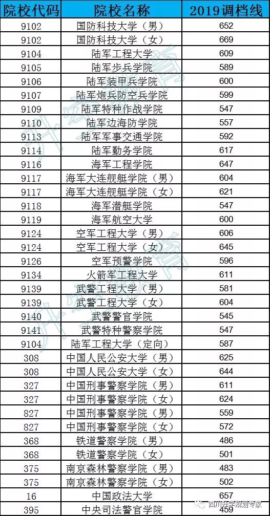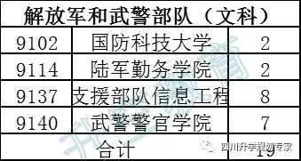 2019年,解放军院校在四川省招收普通高中毕业生680人。招收文科生院校4所,分别是国防科技大学、陆军勤务学院、战略支援部队信息工程大学、武警警官学院,共计划招收19人。